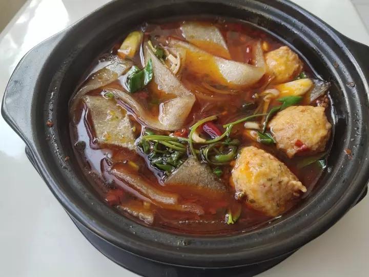 午餐:肉糜茄子粉丝煲,炒青菜,榨菜蛋汤