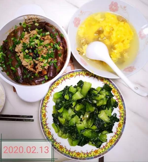 晚餐:大蒜叶炒牛肉,海参蒸蛋,腐乳五花肉