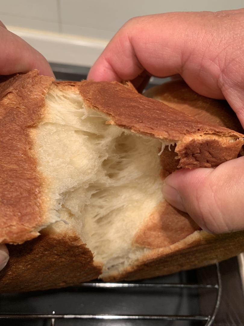 连续两天做了2次,完全按照这个配方和程序做的,人工揉面,虽然没有揉出手套膜,但是出炉的面包还是有拉丝的效果。第一次烘烤时...