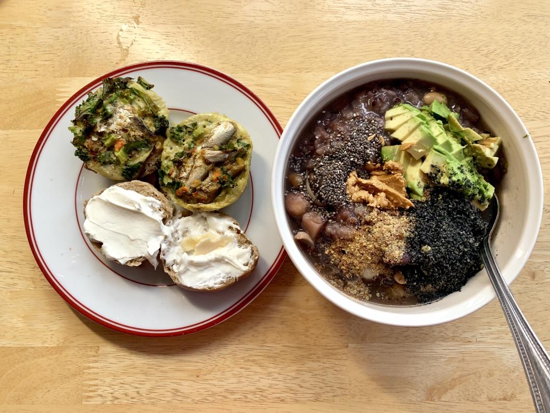 the usual杂粮粥+五种脂肪topping,自制全麦小面包抹酸奶,羽衣甘蓝沙丁鱼鸡蛋muffin