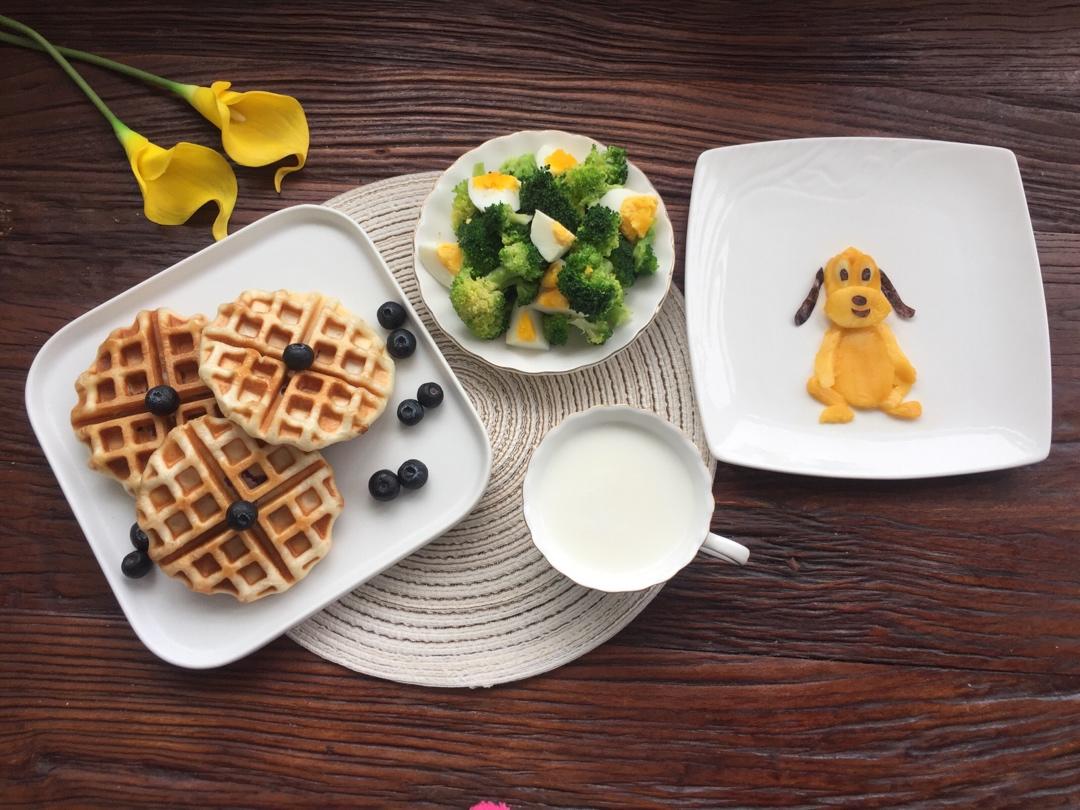 牛奶🥛+紫薯华夫饼🥯+鸡蛋西兰花沙拉🥦+水...