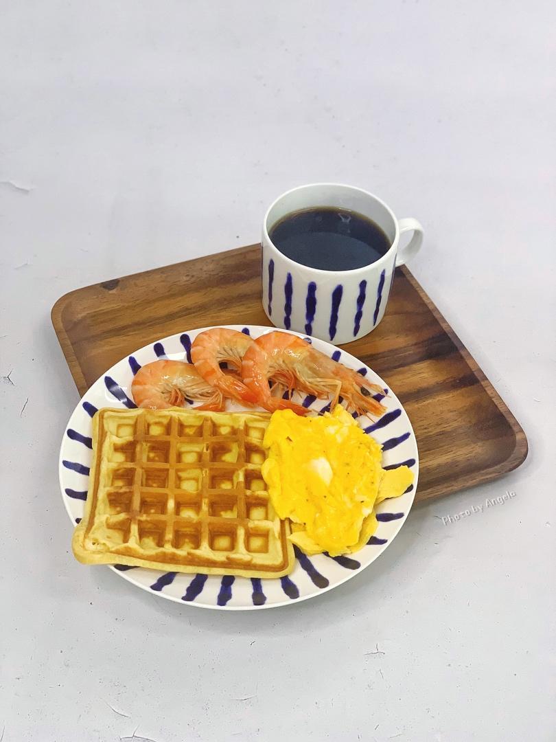 早餐【华夫饼🧇➕滑蛋➕黑虎虾➕咖啡☕...
