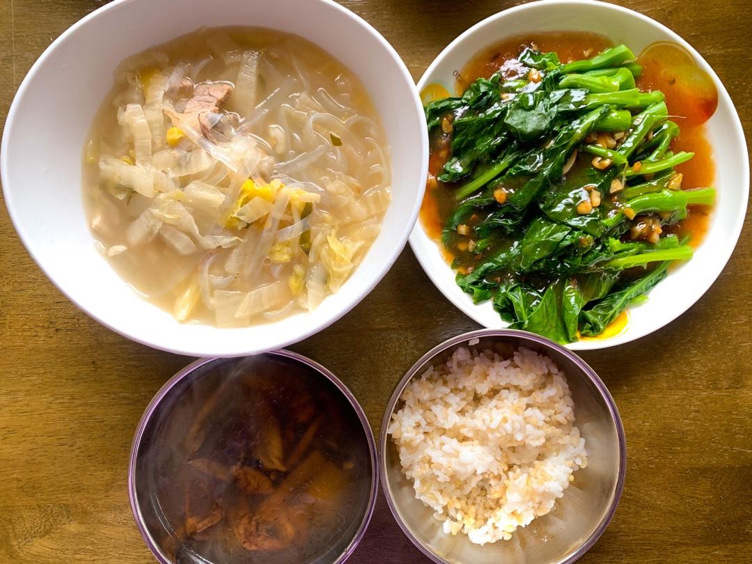 酸菜白肉+蚝油芥兰+蘑菇汤+糙米饭