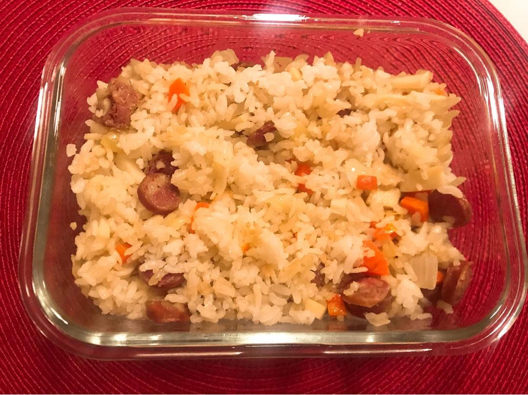 在Costco买到了中式香肠,切片以后加洋葱胡萝卜直接放电饭煲煮一锅饭,吃的时候稍微淋点酱油,简单的美味#午餐•2020...