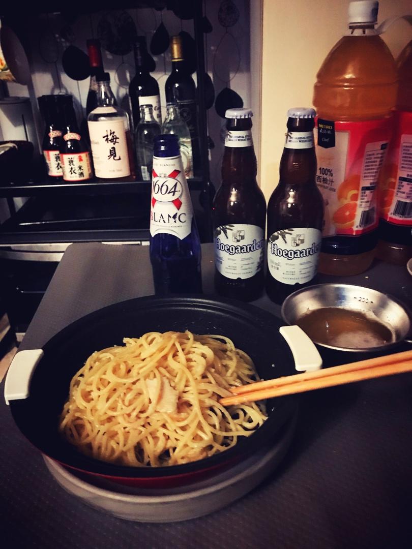 里头放了撕成条的烤冷面皮,前天做的糯米团,卷心菜和一点香肠(年糕还没发货但辣...