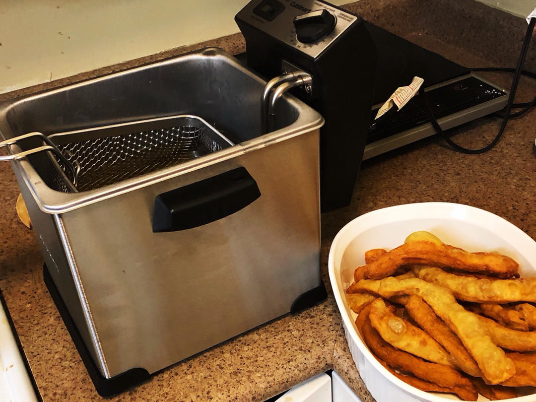 午餐~炸油条,第一次用电炸锅,第一次炸油条(可能是配方没掌握准确,变成炸麻花了,失败!)