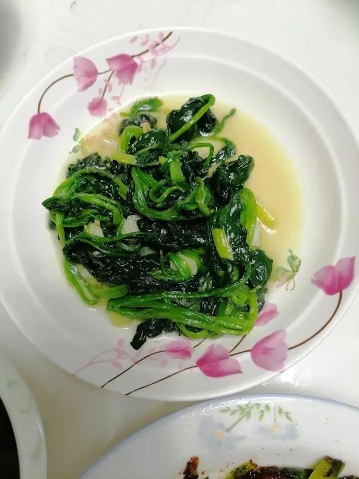 菠菜焯水不超过30秒,热油下葱大蒜子,放菠菜,盐巴