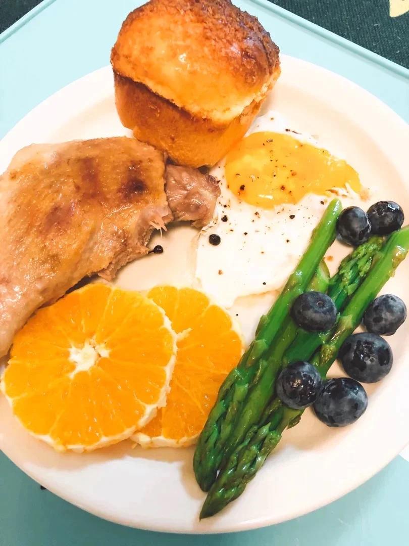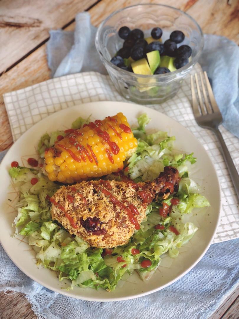 脆皮烤鸡腿+蒸玉米+包菜丝沙拉+牛油果蓝莓,美美的一盘吃完心情也会特别好哦~