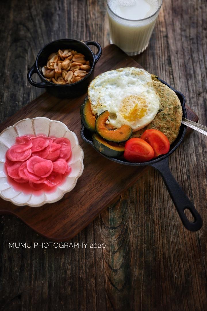 槐花饼,煎蛋,腌萝卜,豆浆