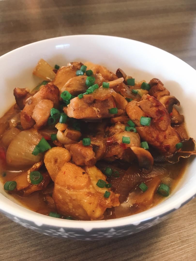 两小勺糖用油炒炒糖色,加香叶桂皮 姜片大蒜炒炒 放鸡腿块上焦糖色,放洋葱块炒炒 再加料酒生抽老抽 胡椒碎 蘑菇块