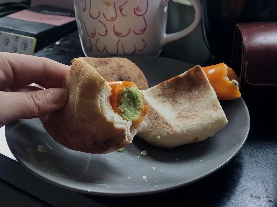 一个奇怪的吃饭:塞在小甜椒里再夹着pita饼吃...我以前觉得柿子椒空口吃是恶魔般的味道,也不知道为啥今年突然觉得生甜椒...