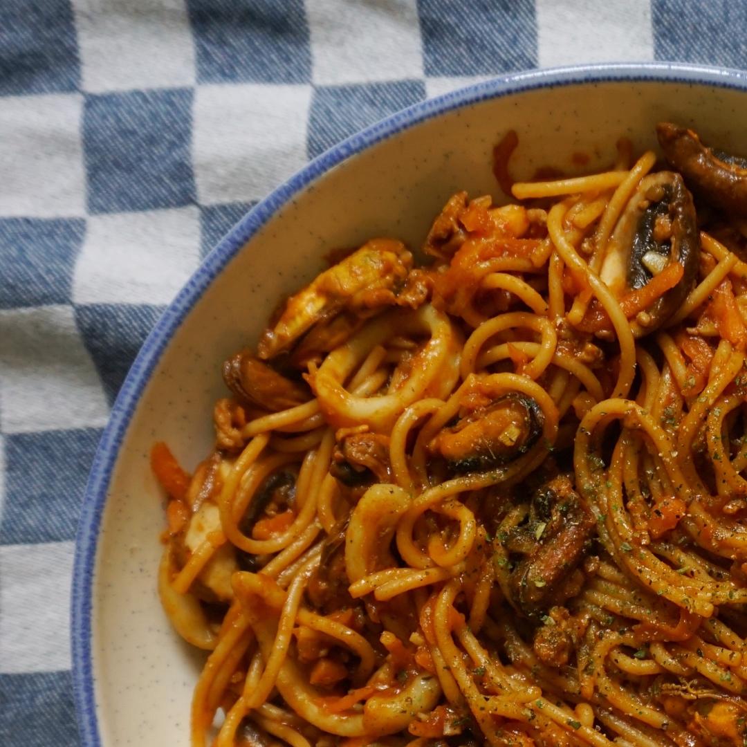 用昨天的肉酱加了胡萝卜蘑菇和海鲜,意面的口感更适合耶!