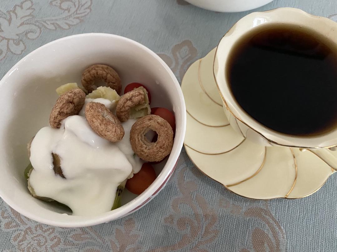 圣女果8颗 酸奶 25克 剩下的冰箱冷藏 猕猴桃🥝半个 一杯黑咖啡