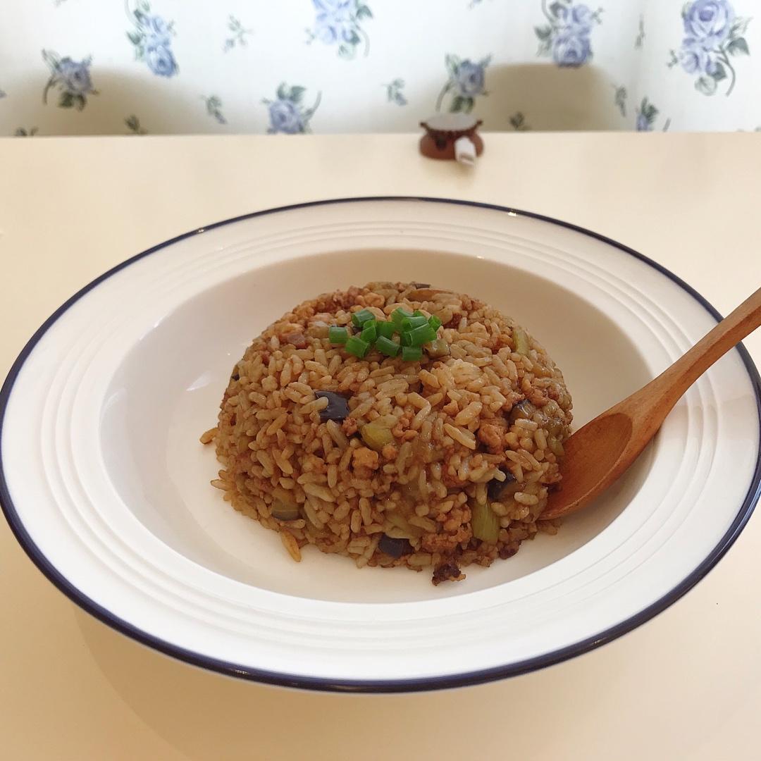 🧺:茄子,肉末,冷藏过夜剩饭,蒜,生抽,黄豆酱,老抽(蚝油,糖)