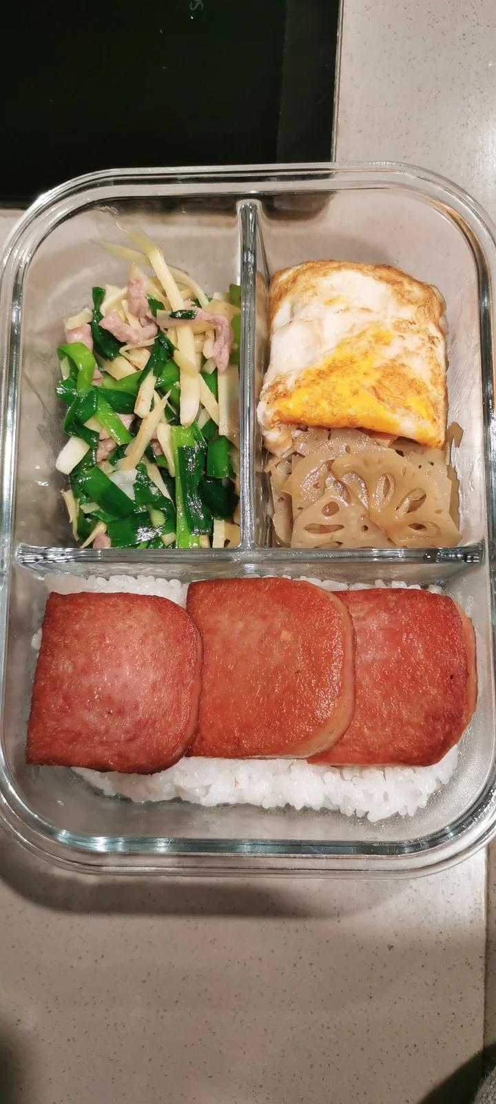 韭菜冬笋肉丝+糖醋藕片+荷包蛋+煎午餐肉