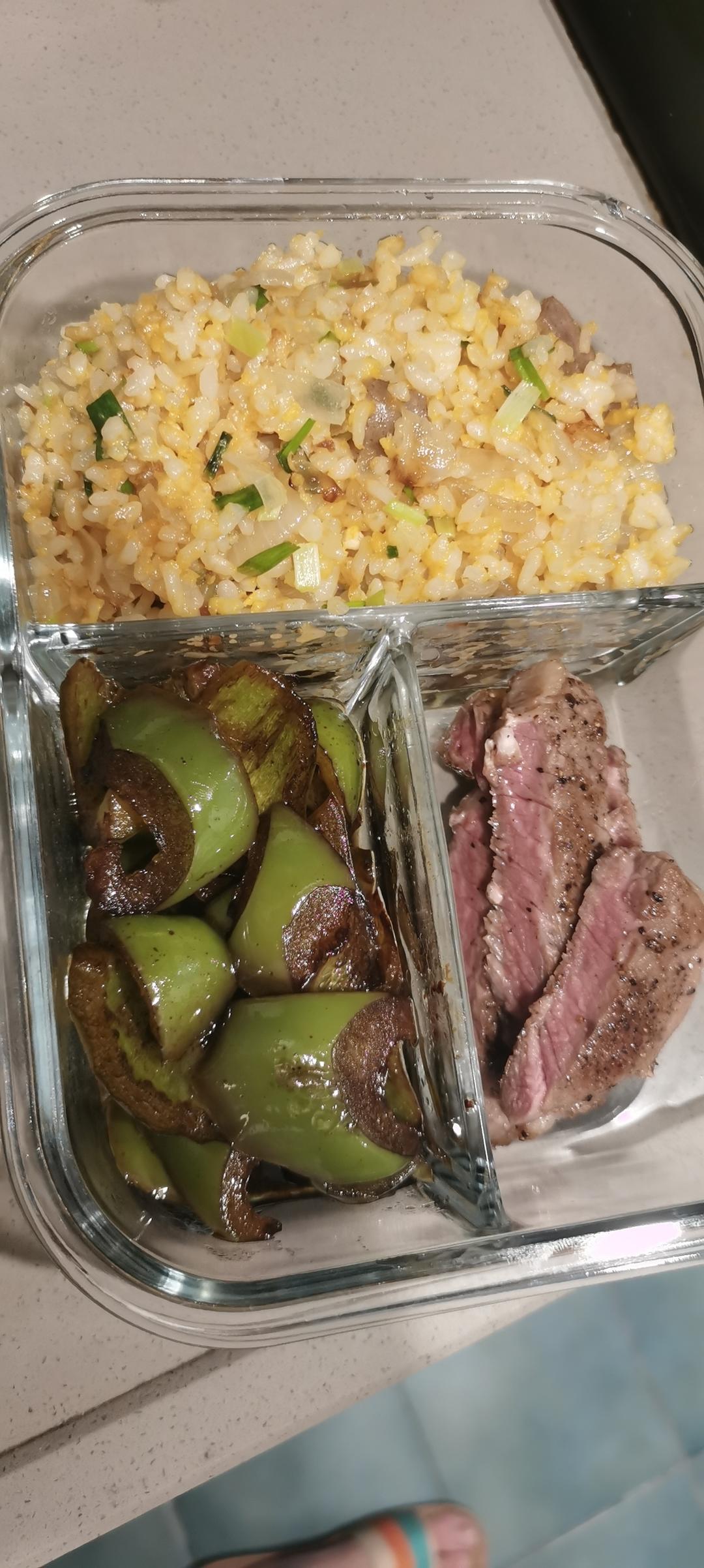 香肠洋葱蛋炒饭+糖醋圆椒+煎牛排