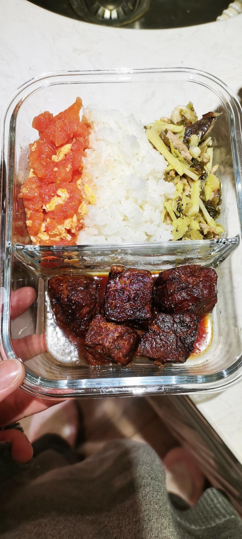 红烧牛腩+咸菜肉丝炒笋丝+番茄炒蛋