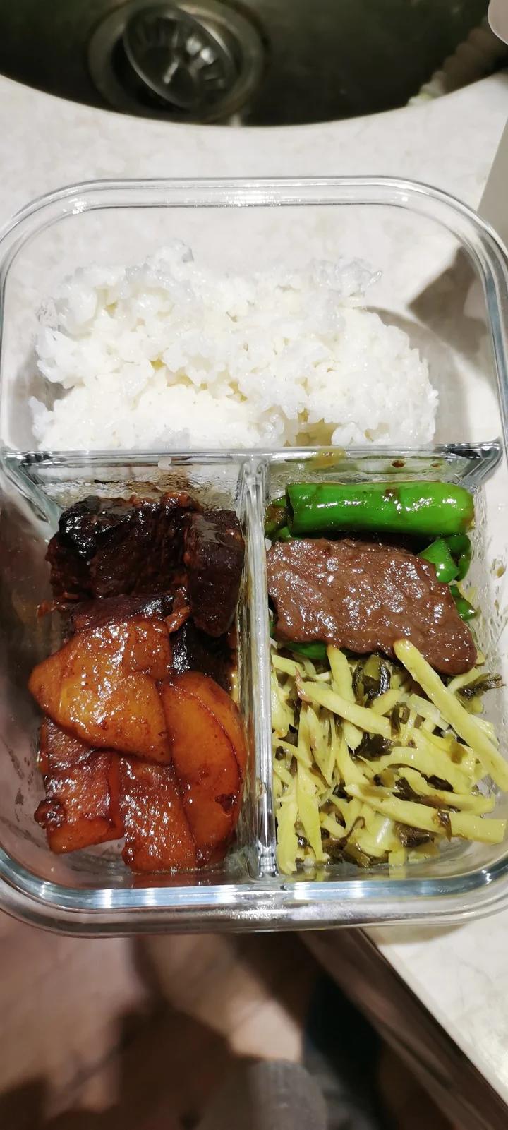 红烧肉烧土豆+尖椒牛肉+咸菜冬笋丝