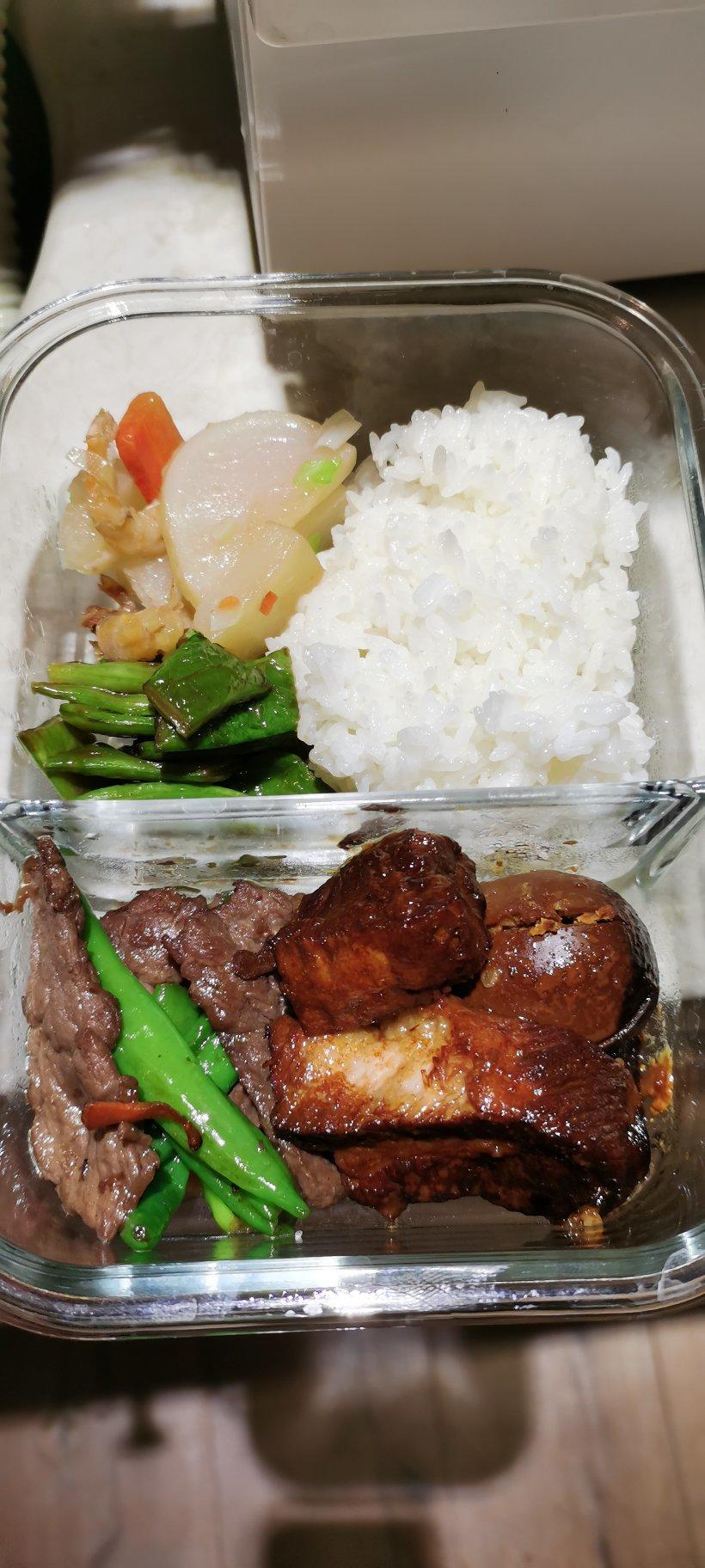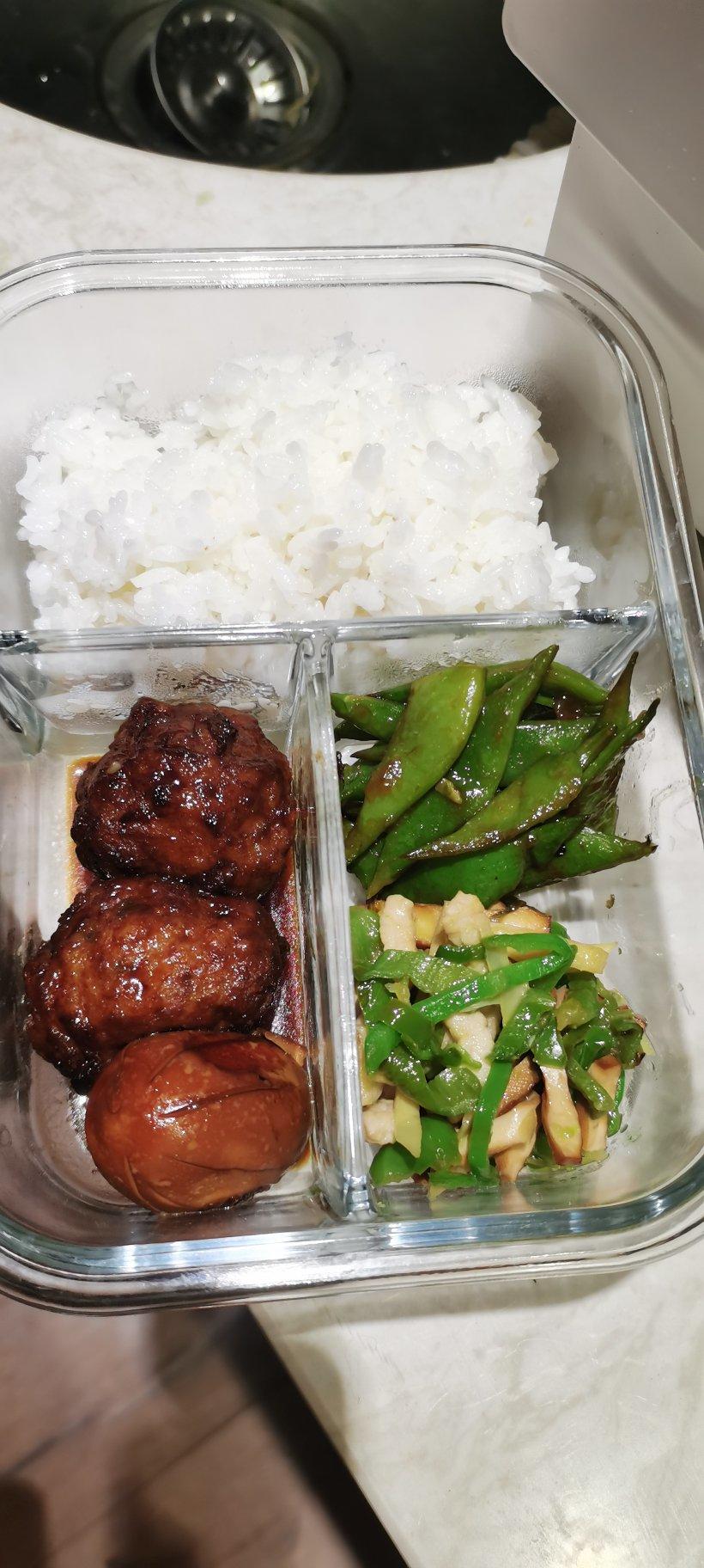 红烧肉圆加蛋+肉丝笋丝豆干炒辣椒+酱爆芸豆