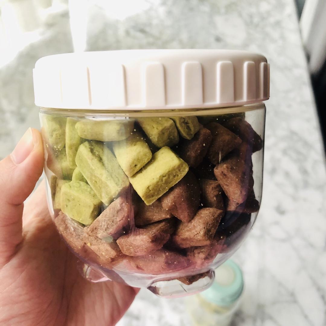 打卡~滴~做了两种味道的小饼干,没想到小娃也很爱吃抹茶口味,一口一个吃得很开心。黄油多加了10g,糖减了10g。很快手,...
