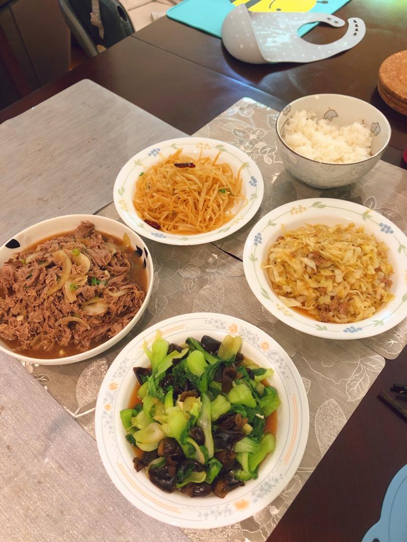炝炒土豆丝,肉末包菜丝,木耳油菜,肥牛盖饭