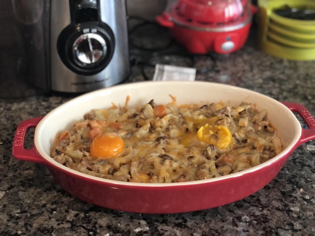 哈哈,家里剩的蘑菇,洋葱,肉末,咖喱,都消灭掉了😝昨天才收到的烤盘,好美,迫不及待地用上了,感觉我买东西还是会为颜值买单...