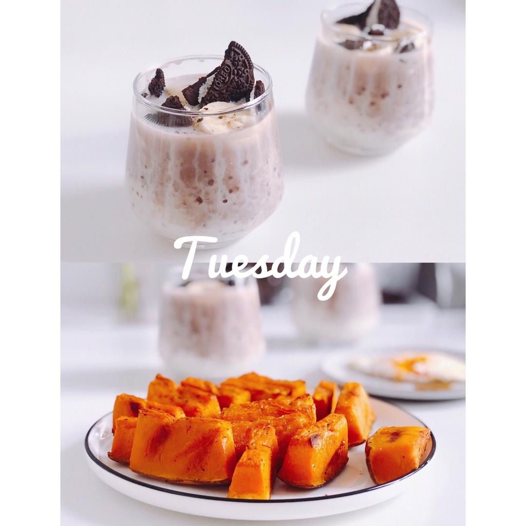 底层香草味,上层可可味的冷藏燕麦杯,加点香蕉和奥利奥。烤南瓜口感竟然有一丝丝神似网纹瓜🙊