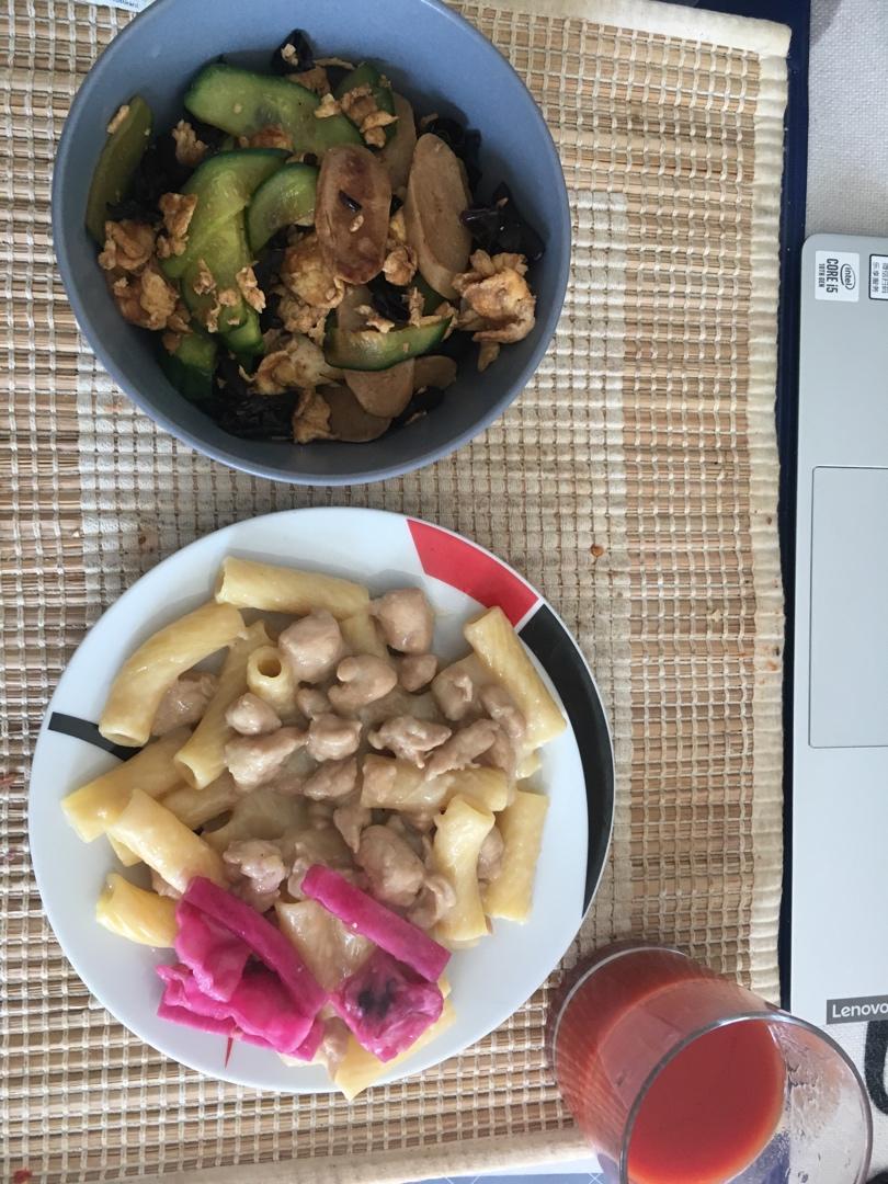 奶油鸡胸意面配泡菜,黄瓜木耳鸡蛋炒火腿肠