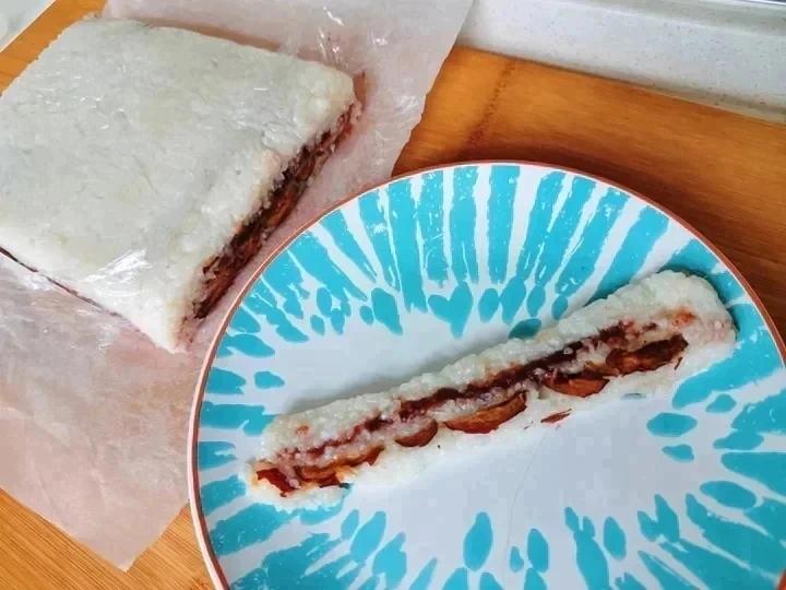 圆糯米粒500克,用水浸泡了一晚(约十个小时)~陈水倒掉,添新水,此时米和水的总重量为1400克~放电饭煲像正常焖普通大...