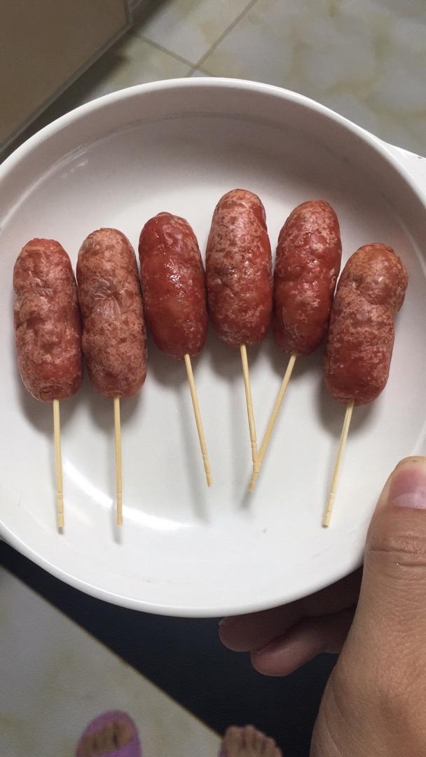 记录:366g猪肉,加了10g的洋葱,其他按配方比例,用2根羊肠。烤箱大火烤15分钟。