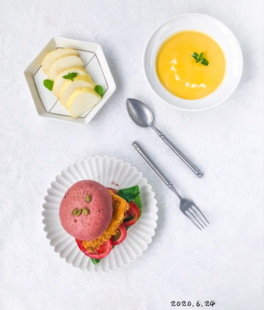 2020.6.24 全麦面包鸡排汉堡包🍔+南瓜浓汤🎃🍲+梨子🍐。