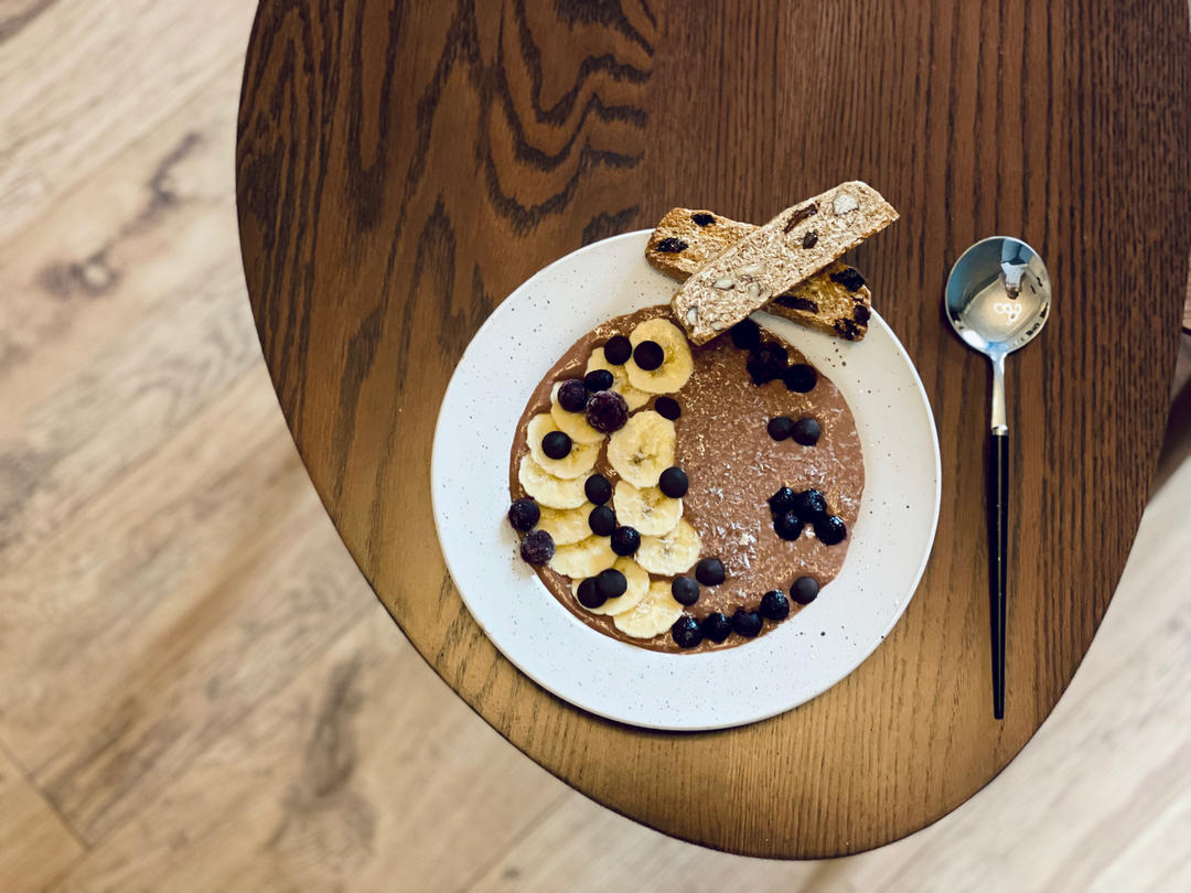 基底:30g燕麦用开水泡熟+70g香蕉+100ml牛奶+10g巧克力豆+2g生可可粉+一撮盐
