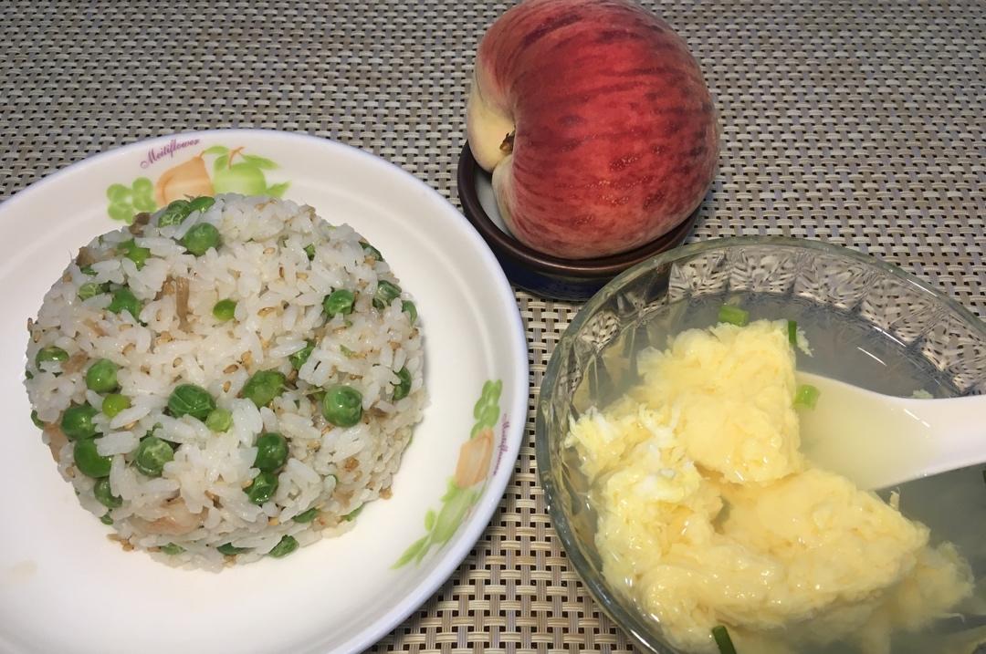虾仁炒饭、蛋花汤、水蜜桃