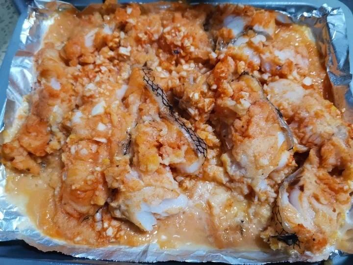 鳕鱼蘸鸡蛋液裹了面包糠,蒜蓉,柠檬皮屑,新奥尔良烤肉酱,喷了味淋,190度10分钟,翻面19...
