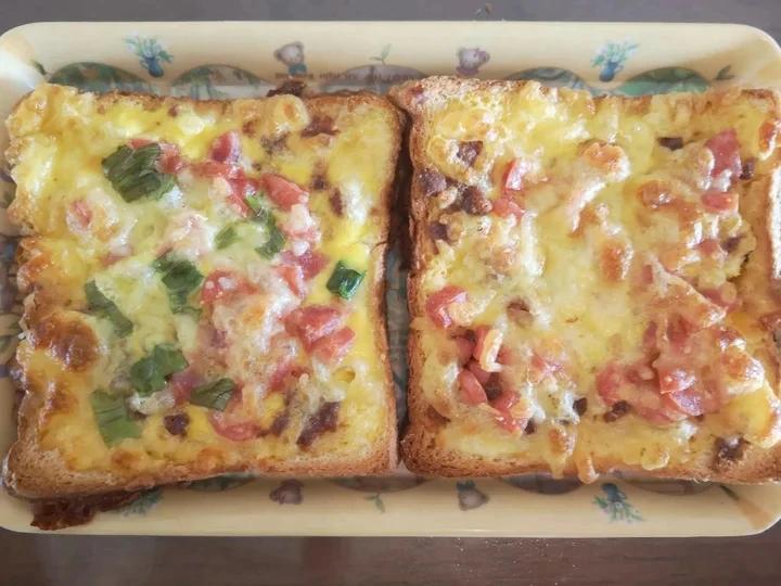 2.蛋液和火腿丁搅拌均匀后浇到吐司片上