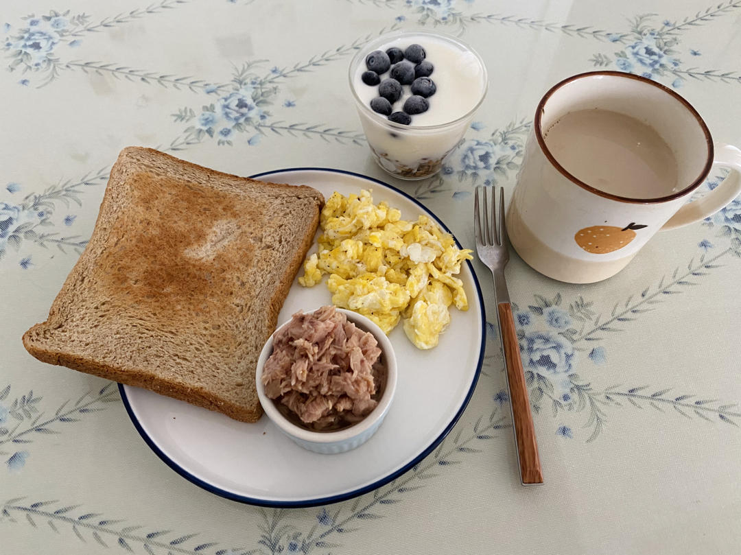 全麦面包➕鸡蛋加金枪鱼➕蓝莓酸奶燕麦➕拿铁