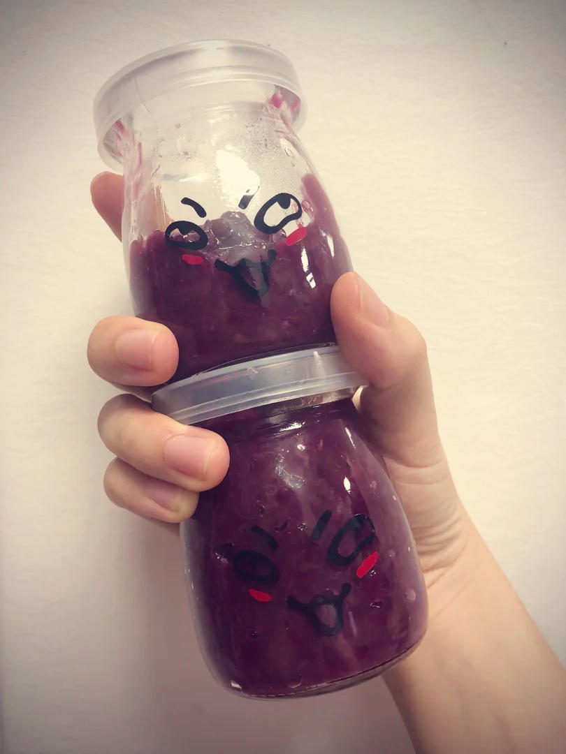 葡萄酱太让人心累了……熬了1h10min……满满一大盘葡萄(无籽😁)出来就这么点儿!最迷你的布丁杯都只能装一瓶半。。😓