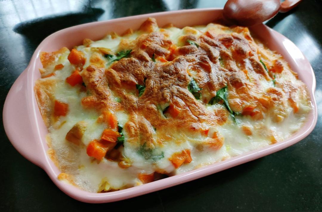 剩米饭用鸡蛋和咖喱粉炒过,盖上浓郁的咖喱鸡腿肉和胡萝卜丁,再铺上马苏里拉芝士,烤出橙色花...