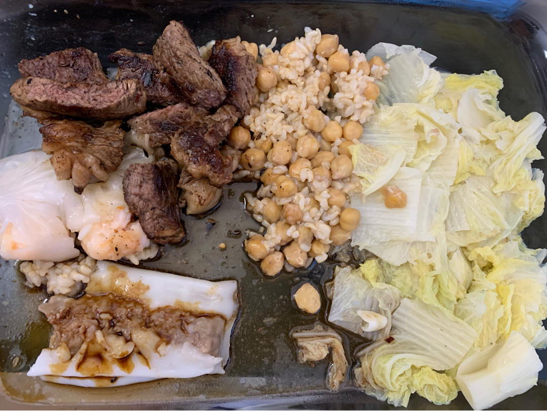 蒜蓉白菜+鹰嘴豆糙米饭+牛排+虾饺+牛肉肠粉~
