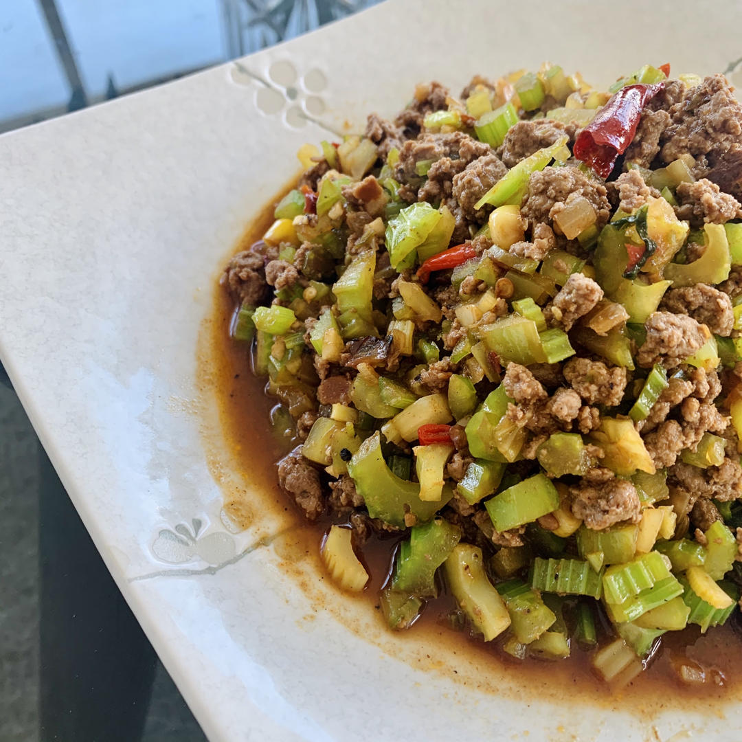 先煸洋葱炒熟牛肉末,在来蒜末小米椒炒香后加牛肉芹菜丁爆炒。调料我喜欢吃辣的,用了郫县豆瓣酱...