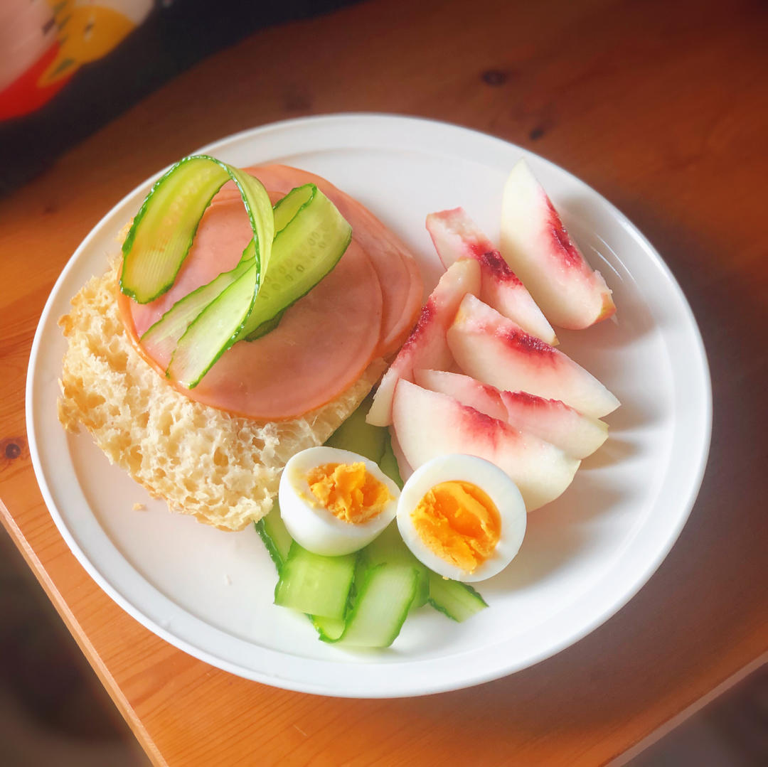 水煮蛋+黄瓜+火腿片+传统面包,脆甜的桃子,十分钟搞定...