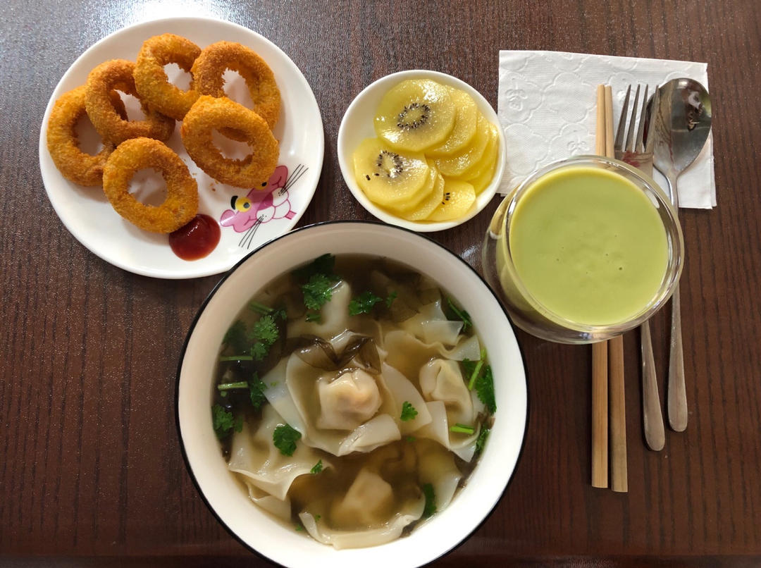 鲜肉小馄炖 炸鱿鱼圈 牛油果奶昔🥛猕猴桃🥝