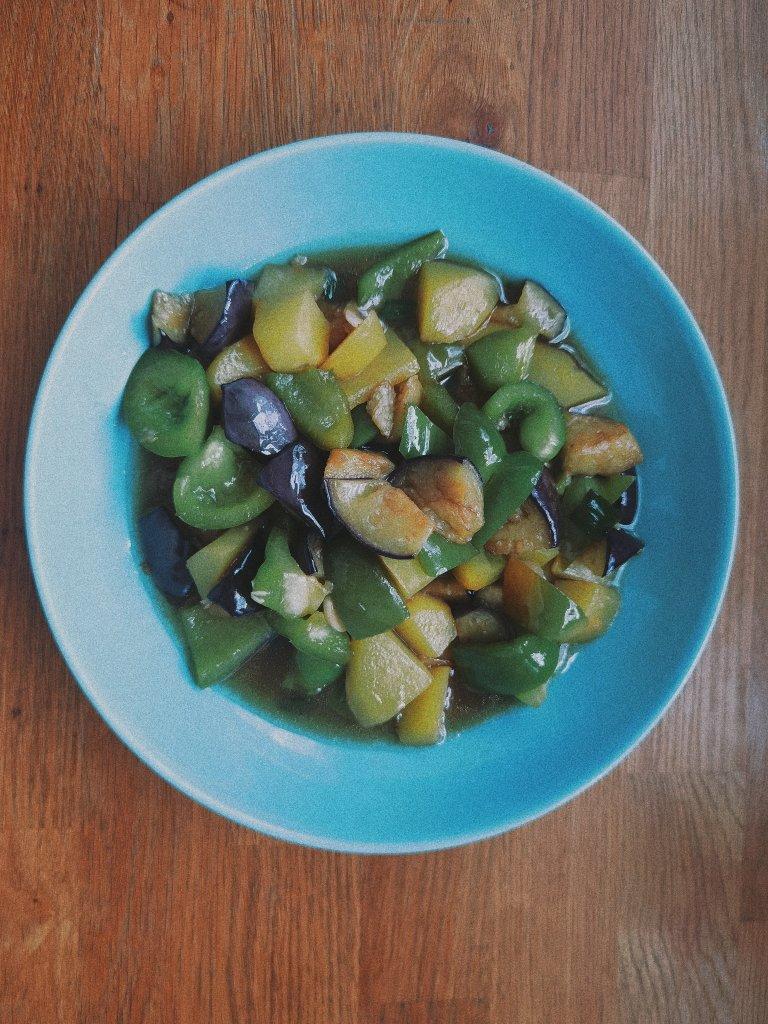 少许油 干辣椒 姜片 鸡块 蘑菇 豆皮 炒香。