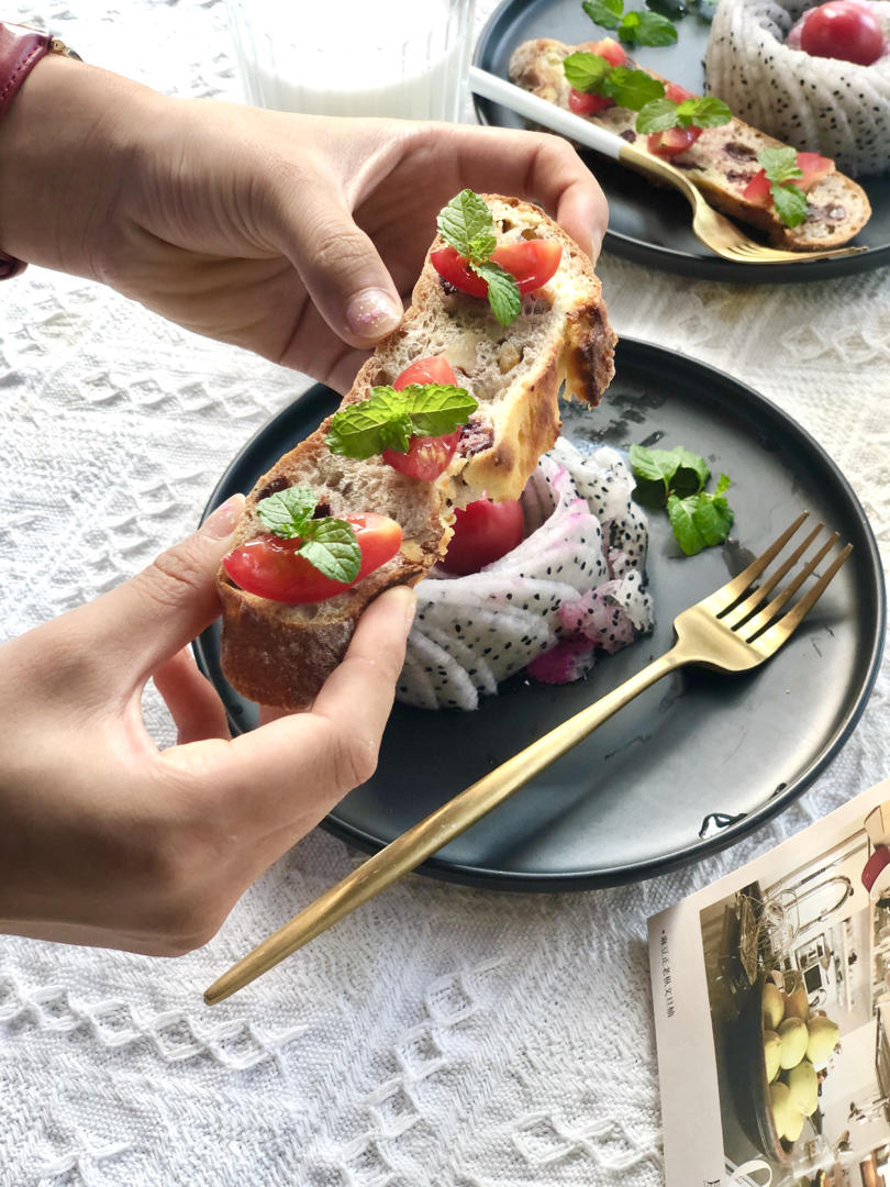 一人份:350ml牛奶,火龙果半个,小番茄2颗,黑麦坚果...