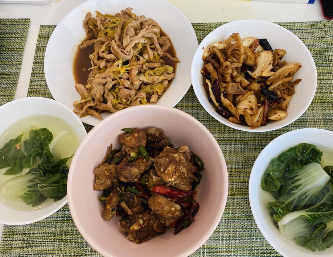有点翻车了的韭黄肉丝和烤排骨,爆炒黄喉牛肚以及备受我不待见的青菜🥱
