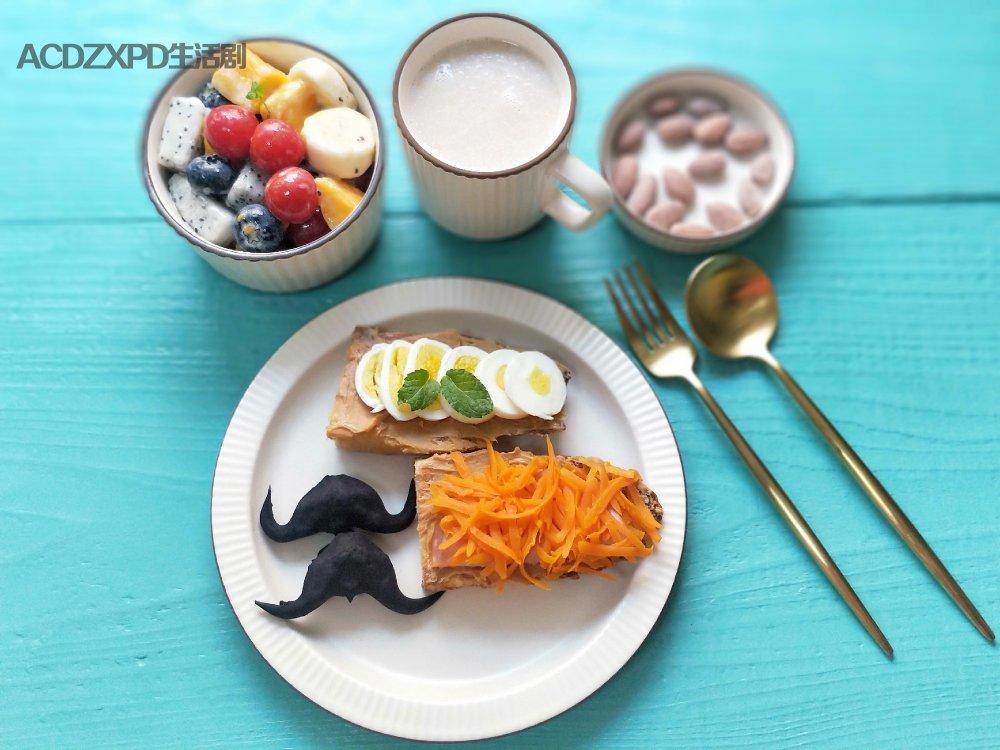今日早餐:醋炒胡萝卜三明治🥪+水果沙拉🍌🍓+牛奶麦片🥛+菱角🥜+坚果🌰
