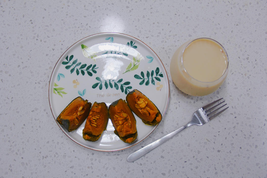 贝贝南瓜130克,脱脂奶茶1杯。