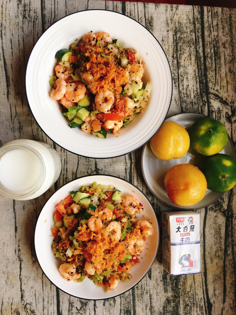 虾仁藜麦饭,秋李&橘子,牛奶