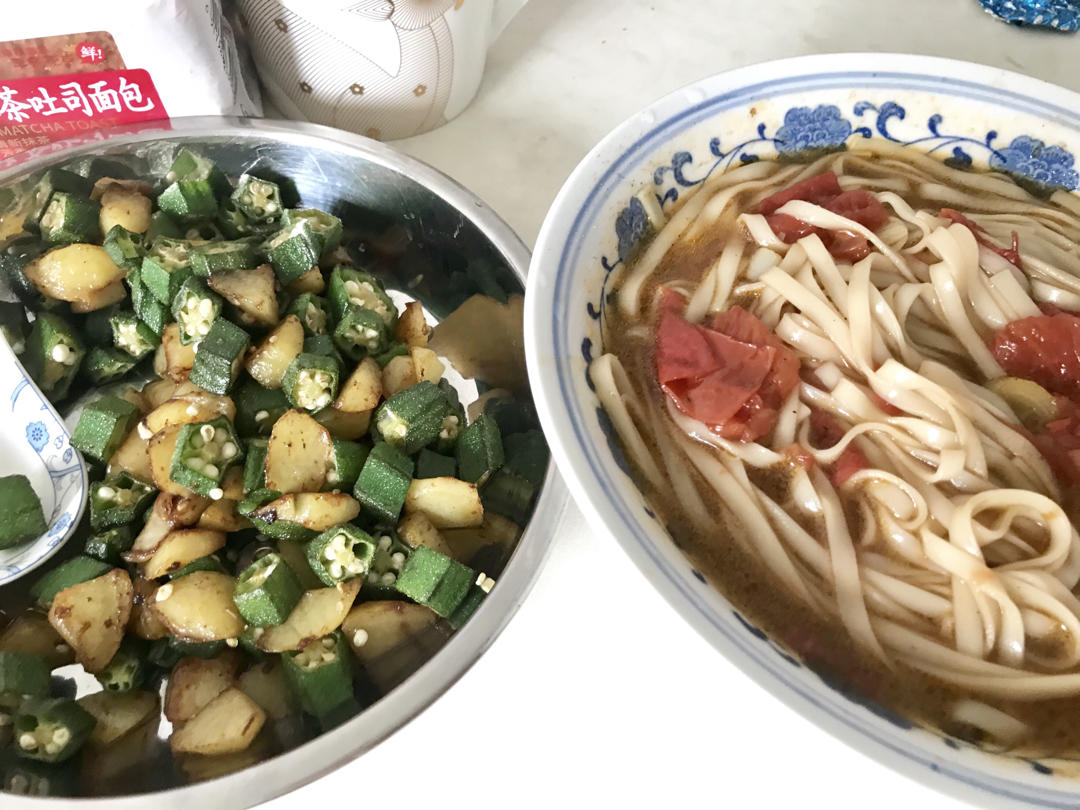 土豆烧秋葵,西红柿挂面