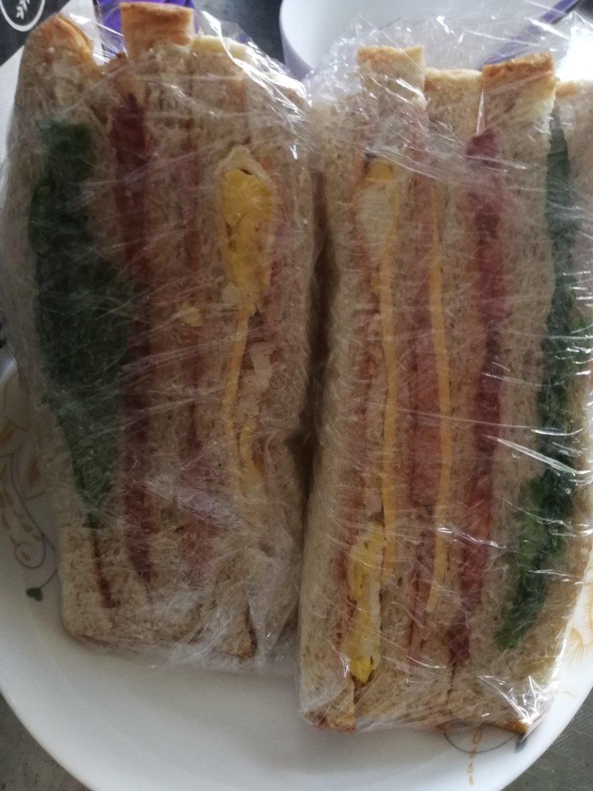 用了五片面包片,加的火腿,鸡蛋,芝士片,生菜叶和番茄片。切开为三角状,吃一块就饱腹了😋